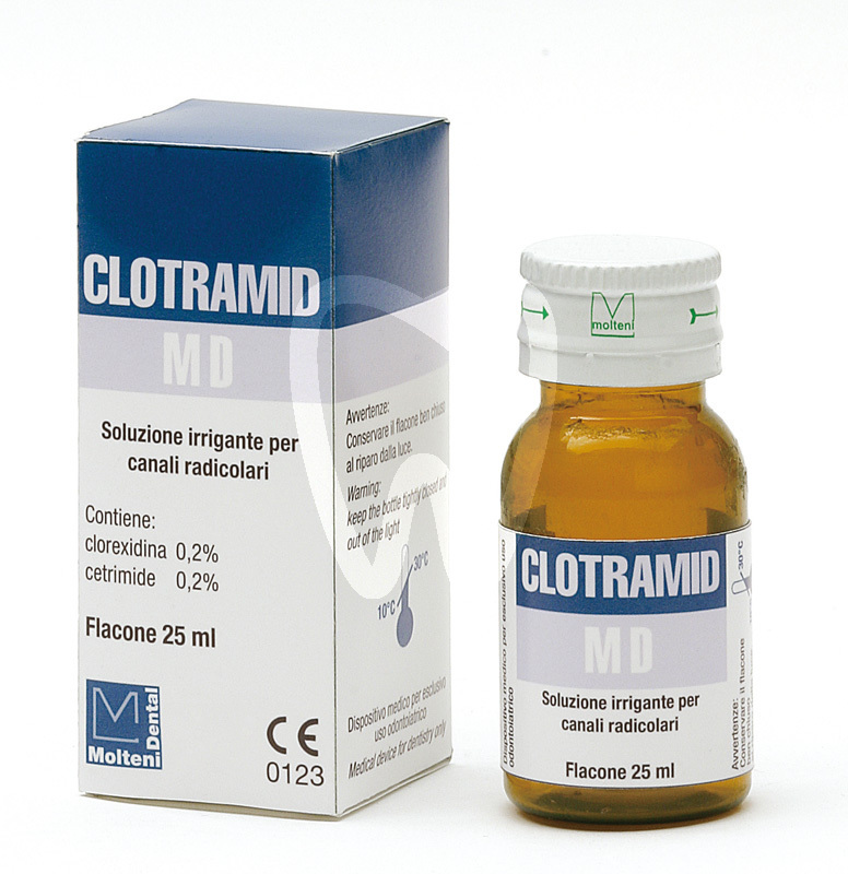 30 days return guaranteeCLOTRAMID Irrigation Solution for Root Canals 25 ml (single bottle) is a disinfecting solution for endodontic canal irrigation, formulated with chlorhexidine digluconate and cetrimide (0.2%). It is intended to support clinical disinfection during root canal treatment by helping reduce microbial load within the canal system. Supplied as a 25 ml bottle for professional dental use.