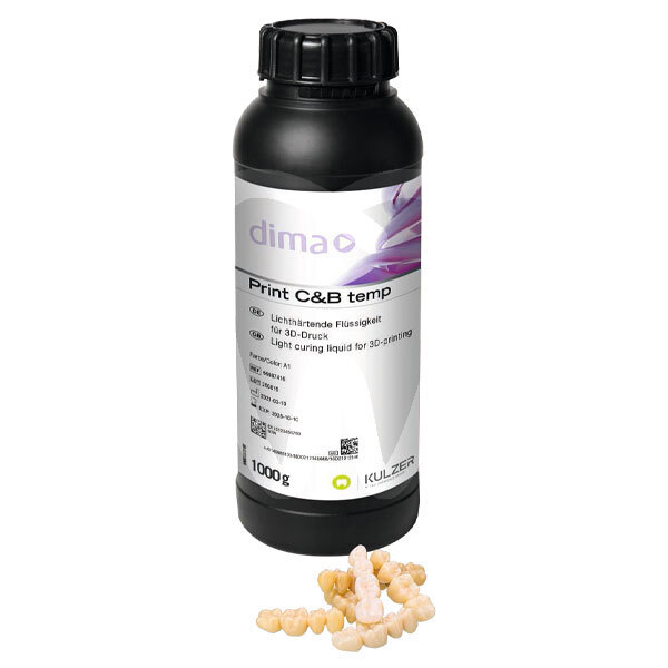 30 days return guaranteeDIMA PRINT C&B TEMP A3 1000G is a Class IIa biocompatible 3D printing resin designed for the fabrication of temporary crowns and bridges with an intended intraoral use of up to 1 year. Developed for CAD/CAM laboratory workflows, it enables the fast production of aesthetic, well-fitting temporaries in less than 1 hour from tooth preparation, helping clinicians and technicians validate key functional and esthetic parameters before delivering the definitive restoration. Sales format: 1 x 1000 g (A3 shade).