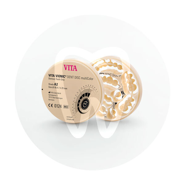 30 days return guaranteeDISCO VITA VIONIC MULTI A2, 20MM is a multi-colour composite denture disc for CAD/CAM fabrication of denture teeth and prosthetic components. Designed for versatile use in partial and complete prostheses, it supports an efficient milling workflow while maintaining high aesthetic standards thanks to its “Perfect Match” colour transition aligned with the VITA shade system. Sales format: 1 unit.