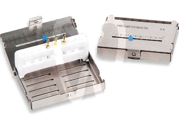 30 days return guaranteeFor 8 instruments. For use in ultrasonic baths. With silicone indicator to count the number of sterilisation cycles. The Nichrominox Endo Pro Sterimeter combines the advantages of an endodontic instrument holder with those of a sterilisation cassette. Specially designed for storing nickel-titanium instruments; forms an endo cassette when closed. The inner Teflon™ holder holds files vertically when opened. After use, files are returned to their holes. 100% stainless steel and Teflon™; suitable for any type of decontamination and sterilisation process. In addition to a graduated scale for measuring lengths, Endo Pro also has a sterimeter – a numbered slot with a silicone marker to count and display the number of instrument sterilisation cycles.