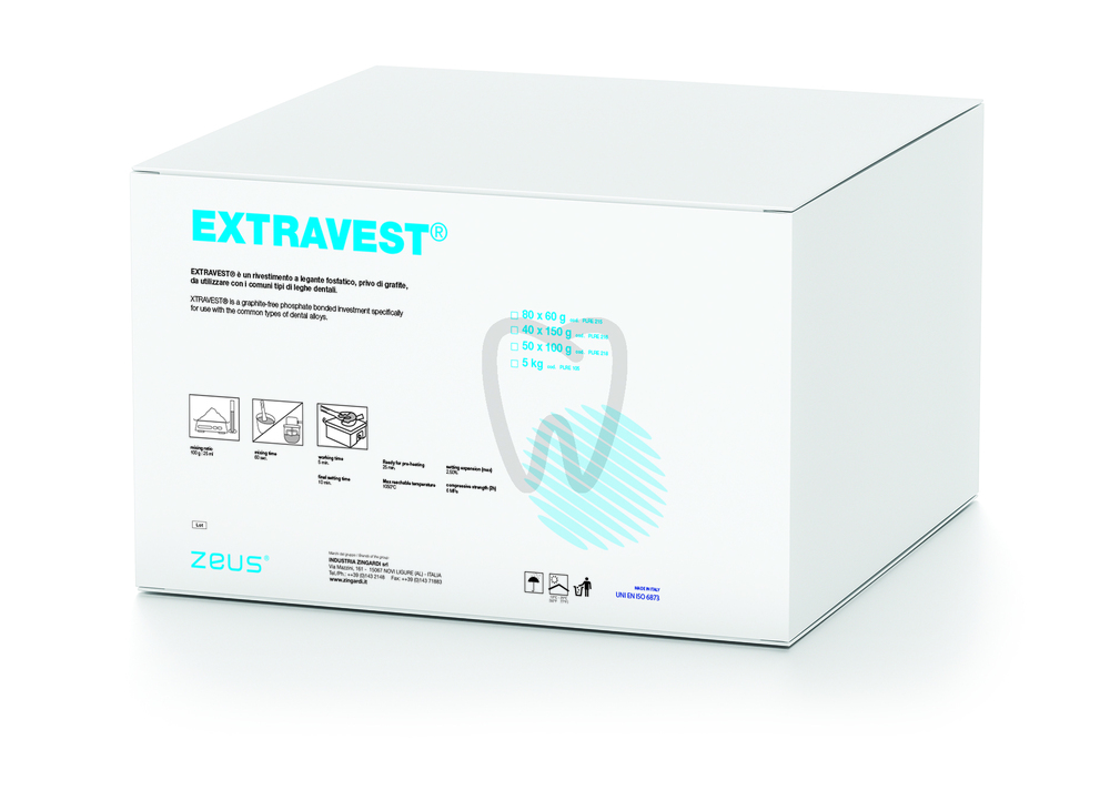 30 days return guaranteeEXTRAVEST ZEUS Phosphate-Bonded Investment S7 for alloys is a fine-grain, graphite-free phosphate investment intended for dental laboratory casting procedures. Designed to support the production of precise castings, it is used to invest wax or resin patterns prior to burnout and metal casting in crown, bridge, and framework workflows where a stable, clean investment is required. Supplied in a practical sales format of 40 sachets of 150 g for controlled dosing and batch consistency.