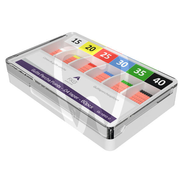 PUNTE DI GUTTAPERCA 4% N.20 are FKG gutta-percha points for endodontic obturation, supplied in a 1x 60 units format. Designed for clinical use in root canal treatment, they support predictable canal filling by combining controlled rigidity for insertion with sufficient flexibility for work in curved anatomies. Their malleability helps achieve an optimal seal, while radiopacity supports visibility on radiographs. They are manufactured under strict hygiene standards and are cadmium-free in composition.