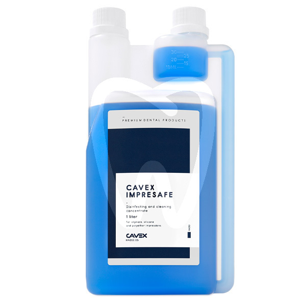 30 days return guaranteeFast-acting, safe, non-toxic and very effective impression disinfectant. Kills bacteria, fungi and viruses in just three minutes. Indications: • Disinfection of alginates, polyethers and silicones. • No negative effects on impression surfaces. • Highly concentrated to save storage space: one litre of Cavex ImpreSafe prepares 33 litres of ready-to-use disinfectant. • Aldehyde-free, neutral scent. • Complies with DGHM guidelines and EN 1040, EN 1275, EN 13727, EN 13624, EN 14561 and EN 14562