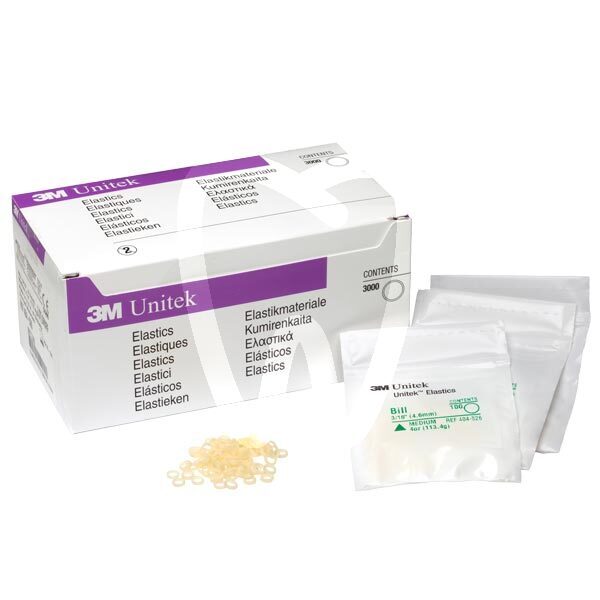 30 days return guaranteeContains Latex • Consistent force • No color additives • Time and cost effective - no need to count,separate, and repackage • Easy, positive identification • Easy to dispense • Patient pack illustration allows written directions on surface. 100 elastics per patient pack, 30 packs per box (Total 3000 elastics). Light 56,7g, slack diameter 3,2mm. Colour purple.