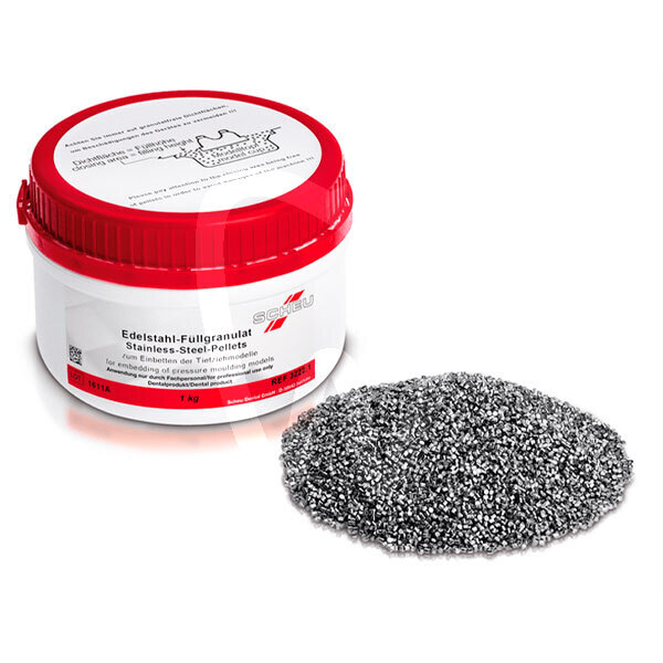 30 days return guaranteePELLETS IN ACCIAIO 1KG. SCHEU are a corrosion-resistant stainless-steel filling granulate designed for dental laboratory thermoforming units. Used as an immersion medium for models during thermoforming, this galvanically polished steel pellet bed helps stabilize the model in the chamber to support consistent sheet adaptation in everyday laboratory workflows.