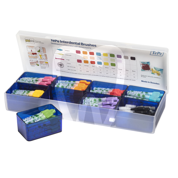 30 days return guaranteeThe TePe Interdental Brush Assortment Kit is a professional organizing box designed for dental clinics to store, display, and select interdental brushes by size during prevention and prophylaxis appointments. It is intended to support chairside size determination and patient education on correct interdental cleaning techniques. Sales format: 120 units (15 units x 8 different diameters).