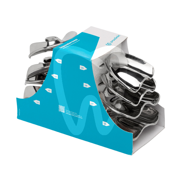 30 days return guaranteePack of 8 impression trays for patients with no teeth. Made of non-perforated stainless steel. With retention lip. Contains 4 upper impression trays and 4 lower impression trays. Sizes: U6, U7, U8, U9 and L6, L7, L8, L9.