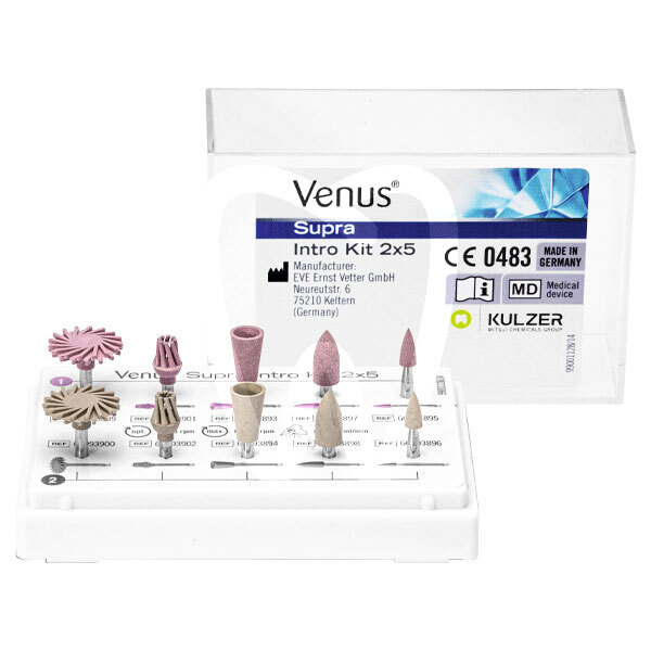 30 days return guaranteePULITORI PER COMPOSITO VENUS SUPRA INTRO KIT is a two-step dental polishing kit designed for finishing and long-lasting polishing of composite restorations. Intended for clinical use, it combines pre-polishing and high-gloss polishing shapes to help achieve smooth surfaces and stable shine on both anterior and posterior restorations, with excellent performance especially when used with Venus composites.