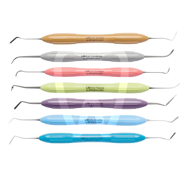 LM-Arte is a set of innovative instruments for aesthetic restorations. They have been developed in collaboration with Style Italiano, a group of dentists specialised in aesthetic dentistry. The LM-Arte instrument tips have been specifically designed for composite layering. Manufactured in highly-polished, non-stick LM-DuraGradeMax® supersteel. Each LM-Arte instrument is colour-coded and named according to its main function for rapid restorative procedures and efficient, simple composite layering. Applica – Apply elastically. A thin, flexible spatula designed for precise application and modelling of aesthetic composite. Condensa – Push softly. A large, rounded plugger designed especially for composite modelling. Fissura – Sculpt delicately. A modelling instrument with extremely sharp, pointed tips. Misura – measure precisely. A unique instrument for horizontal and vertical measurement of composite layer thickness. Eccesso – Finish neatly. An instrument designed for the removal of composite and bonding agent residue.