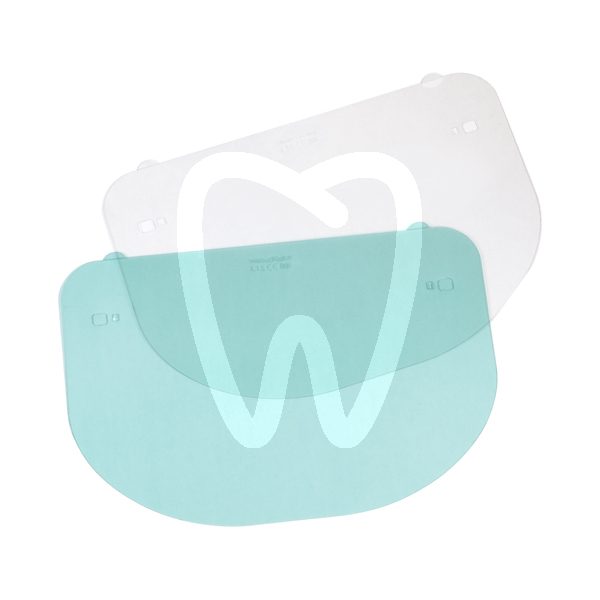 Indicated for dental clinics and healthcare environments as facial splash protection during procedures and tasks that may generate droplets or liquid splashes. Suitable as replacement visors for professionals who require a clear field of view while working at chairside or in sterilization and clinical support areas. Remove the green protective film prior to fitting and use.