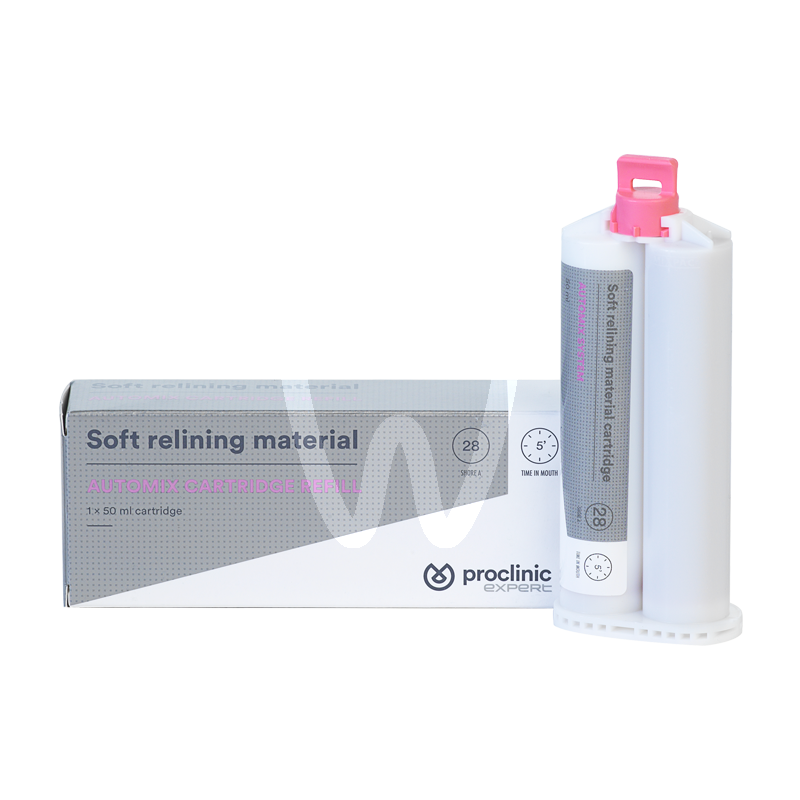 30 days return guaranteePermanent, soft, cold-curing, A-silicone relining material in cartridges to quickly and easily improve denture fit and comfort in just one session. Proclinic Expert Soft Relining Material has been developed for permanent and direct soft relining that remains comfortable for a longer period of time thanks to its permanent elasticity, which absorbs pressure. The thixotropic consistency of Proclinic Expert Soft Relining Material makes it easier to apply and helps it stay in place once applied. Fast intra-oral set without producing heat. Bonds firmly to all types of acrylics. Biocompatible, odourless and tasteless and with high dimensional and shade stability. Indications:- Soft relining material for complete and partial, temporary or permanent dentures.- Enhanced support and comfort thanks to its soft consistency.- Indicated for extending the edge of dentures.- Indicated in cases of atrophy, mouth ulcers, inflammation and post-operative relining.
