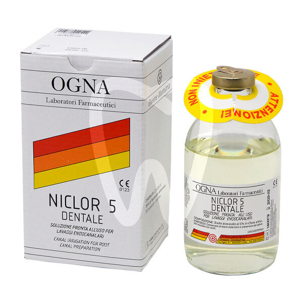 30 days return guaranteeNICLOR 5 is a standardized solution for root canal irrigation in endodontics. Designed for canal lavage, it helps dissolve organic residues and supports debridement by assisting in the removal of necrotic tissue and debris before and during endodontic procedures. Supplied in a 250 ml format for in-clinic use.