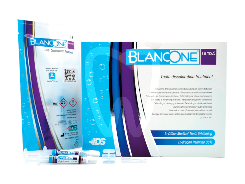 NEW BLANCONE ULTRA + MULTI KIT is a professional in-clinic prevention and prophylaxis whitening system designed to support the management of dental discolorations. The kit combines single-cycle sachets with whitening gel and a photo booster to integrate into chairside protocols aimed at improving tooth shade under professional supervision.