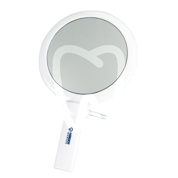 30 days return guaranteeDouble-sided patient mirror. Front 1:1, back twofold magnification. 13cm diameter, solid white plastic frame and handle.