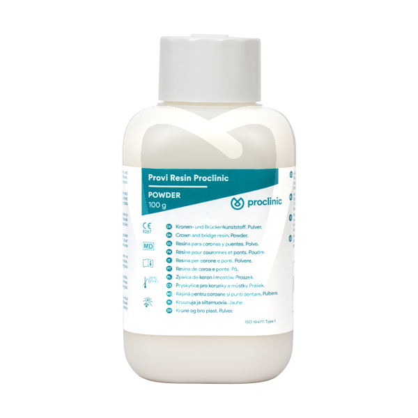 RESINA PROVI PROCLINIC POWDER INCISAL E01 100 g is a tooth-colored, self-curing provisional acrylic resin based on methyl methacrylate (powder and liquid system). Designed for dental laboratory workflows, it is indicated for indirect, extraoral fabrication of temporary crowns and bridges, as well as dental additions and repairs in prosthetic applications where an incisal shade is required.