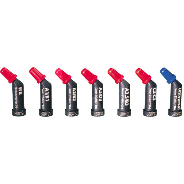 30 days return guaranteeComposite for anteriors with a new inorganic nanohybrid filler formulation; with pre-polymerised particles and a new generation of opalescent particles. The professional is free to choose the aesthetic reconstruction technique: Monochromatic technique, (or conventional). With a shade guide made from the same composite, choose 1 shade from the 6 dentine shades. Vita Duo Shades (= 12 shades) and perform bulk reconstruction. Simplified layering technique, (2 shades) choose 1 shade from the 6 dentine shades using the shade guide made from the same composite. Vita Duo Shades (= 12 shades) and choose 1 shade from either Enamel Universal or Enamel White Opalescent and reconstruct with layering. The exclusive Synergy® D6 shade guide can be used to blend the two shades of composite selected and therefore check the colour combination for the final result with complete confidence. - Excellent handling, soft in anteriors but firm enough to be packed into posteriors. - Does not stick. - Maintains anatomic shape until light-curing. Does not slump. - Facilitates the creation of good contact points. - Reduced curing shrinkage. - Fast and excellent polish. - Natural, opalescence effect. - Invisible restorations.