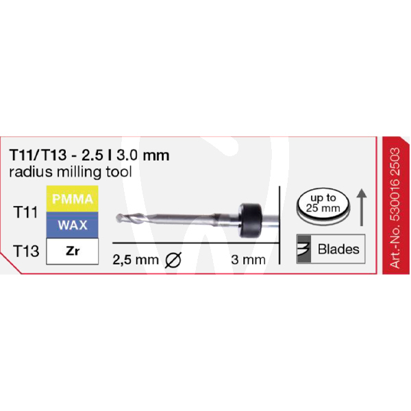 30 days return guaranteeThe IMES 3 mm Bur T11/T13 2.5 mm 530016 2503 is a CAD/CAM laboratory milling bur designed for use with IMES milling systems. It is intended for precision machining during digital workflows, supporting consistent milling performance in dental laboratory production where compatible tool holders (T11/T13) are required.
