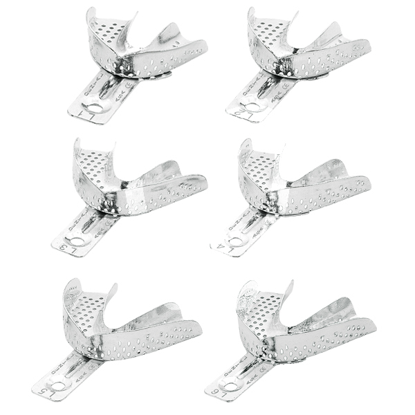 Perforated impression trays made of aluminium.The handle is located in the middle of the tray between the upper and lower lips, allowing the lips a natural position during impression taking. No retentive rims.