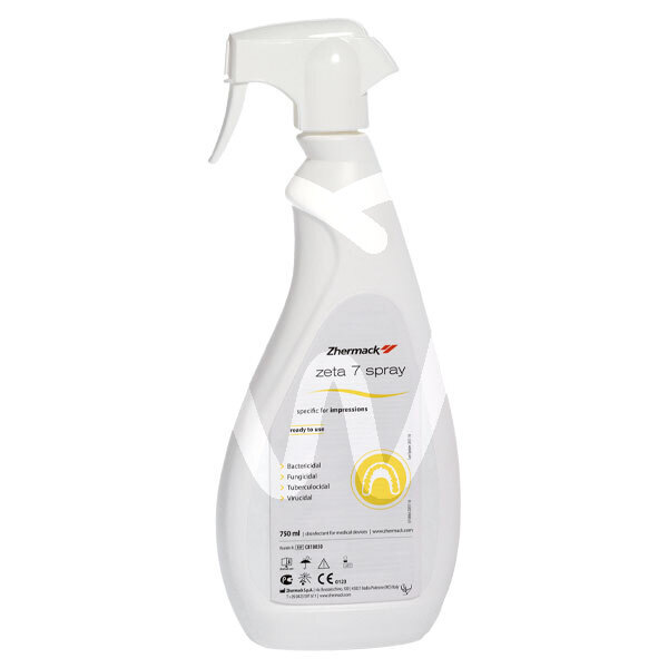 30 days return guaranteeZETA 7 SPRAY WITH NEBULIZER is a ready-to-use disinfectant designed for quick and straightforward disinfection of dental impressions in both the dental practice and the laboratory. Supplied as 1 x 750 ml bottle with nebulizer, it supports routine infection control workflows immediately after impression removal and before further handling, transport, or model pouring.